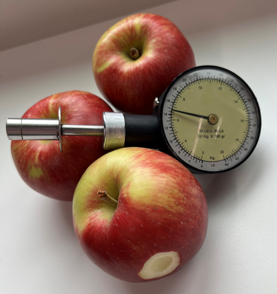 Die Fruchtfleischfestigkeit sollte für die Sorte Elstar zur Ernte 6,5-7,0 kg/cm² betragen. Gemessen wird dieser Wert mit einem Penetrometer. Dazu wird bei einem Apfel die Schale dünn weggeschnitten und dann mit dem Kolben des Penetrometers das Fruchtfleisch bei konstantem Druck penetriert. Auf der Anzeige kann man dann das Ergebnis ablesen.