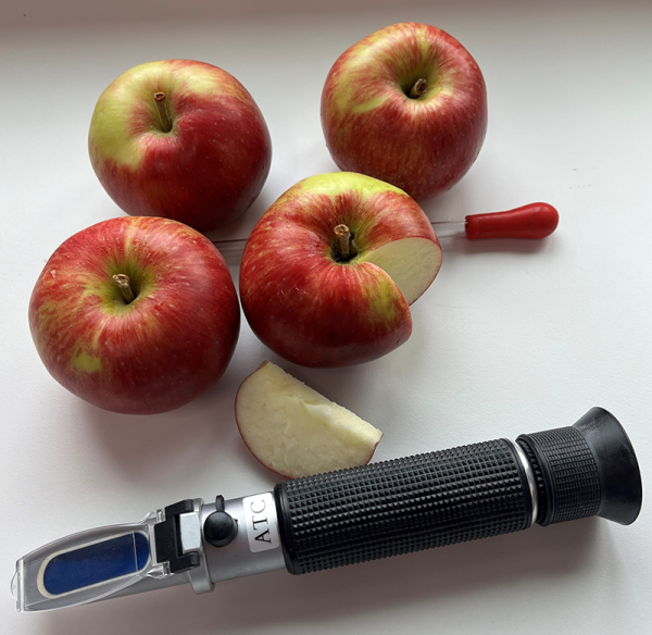 Mit einem Refraktometer kann man den Fruchtzuckergehalt in Brix messen. Dazu zerschneidet man einen Apfel und träufelt seinen Saft auf das Prisma des Refraktometers. Blickt man nun durch die Linse erkennt man den Fruchtzuckergehalt auf einer Anzeige. Dies funktioniert, weil je nach Fruchtzuckergehaltes das Licht im Prisma anders gebrochen wird. Je mehr Zucker der Apfel enthält, desto reifer ist er. Ein Elstar sollte mindestens 10,5°Brix zur Lagerreife aufweisen.