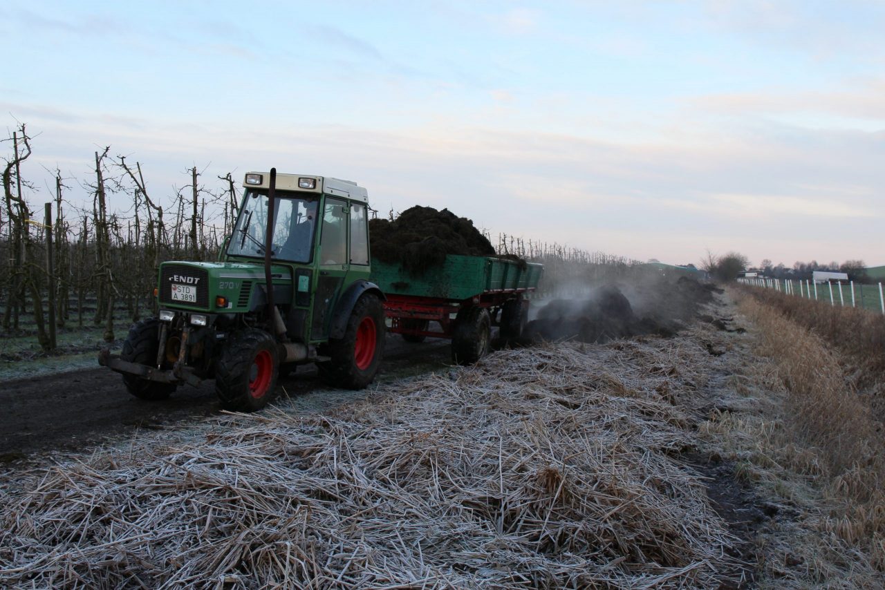 5. Ausbringung: der fertige Kompost wird im Mai in die Kultur ausgebracht. Dabei werden ca. 1 kg Kompost pro Apfelbaum verwendet. Diese Menge wird zunächst unter den Bäumen verteilt und in einem weiteren Arbeitsschritt in das Erdreich eingearbeitet.