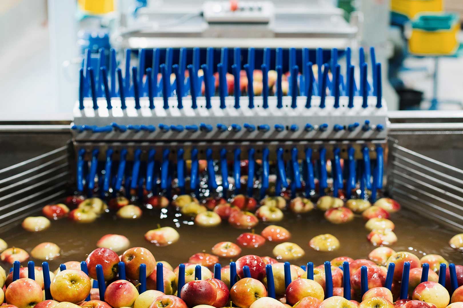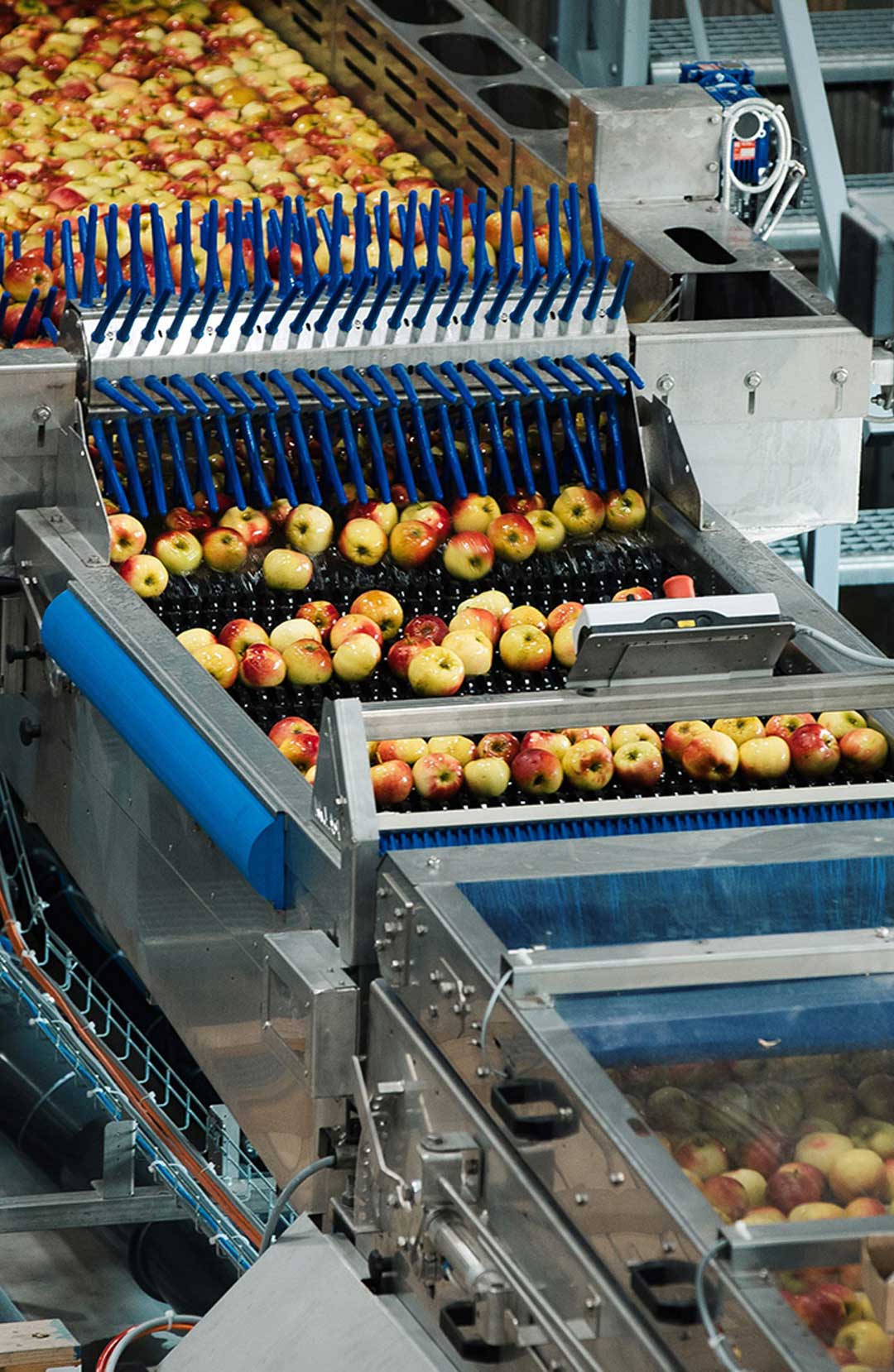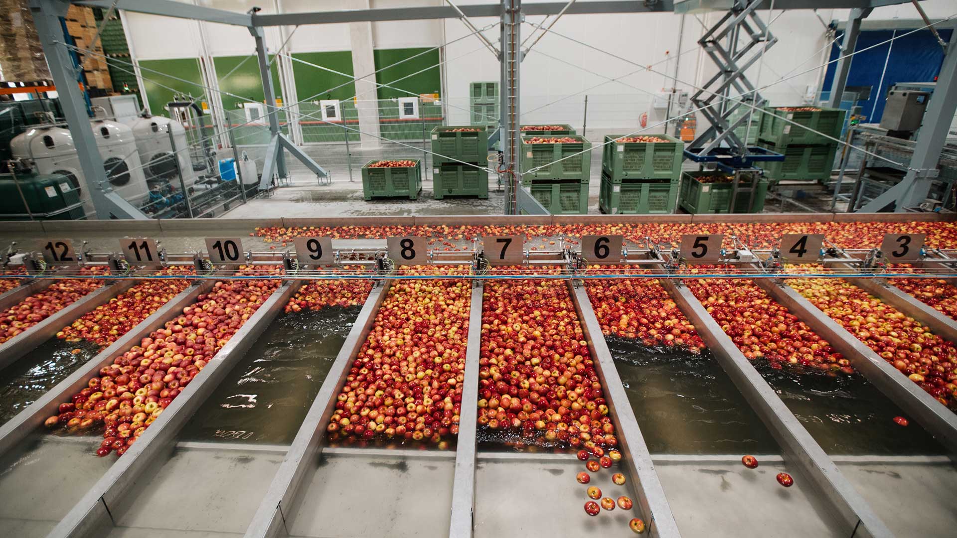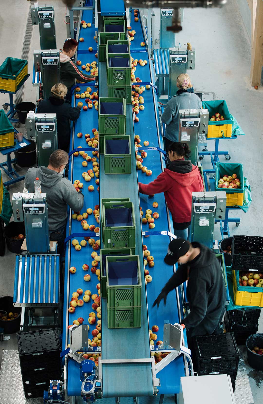 Auf der zweiten Sortiermaschine können Birnen oder kleine Partien Äpfel mit einer Leistung von ca. 2,5 Tonnen pro Stunde vorsortiert werden. Nach der Sortierung kommt die Ware in ein Kühllager, welches ein Gesamtvolumen von 600 Tonnen Äpfel fassen kann.